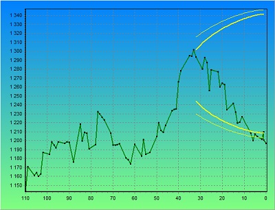 - If the price of Gold enters the funnel between the two thick yellow lines, and stay in that funnel, we will be making money! (What is the chance of this happening? My thinking is the odds are in my favour on this trade!)